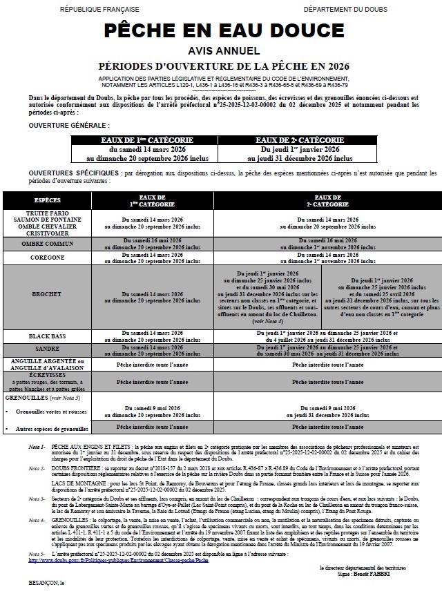 PECHE : Avis annuel périodes d'ouverture de la pêche en 2026