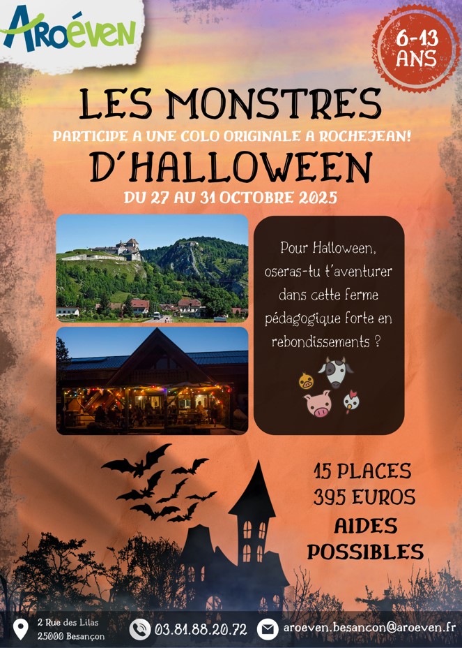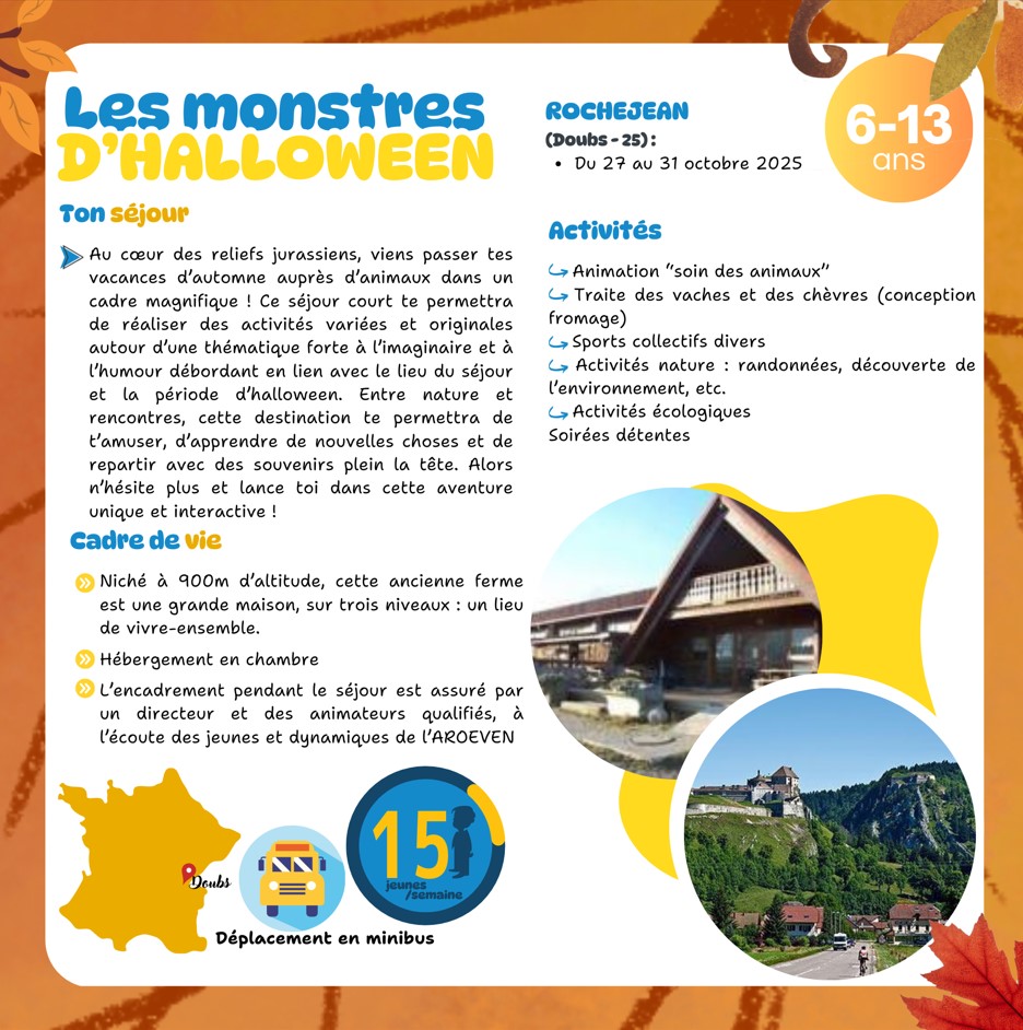 L’Association Régionale des Œuvres Educatives et de Vacances de l’Education Nationale (AROEVEN) de Franche-Comté vous propose un séjour de vacances d’une durée de 5 jours, du 27 au 31 octobre, dans une ferme pédagogique du Haut-Doubs. Cette expérience marque l’opportunité d’évoluer auprès de différents animaux mais aussi de s’inscrire dans une thématique forte autour de la période d’halloween. Entre un fort imaginaire et une pratique ludique, venez participer à un séjour court et original !