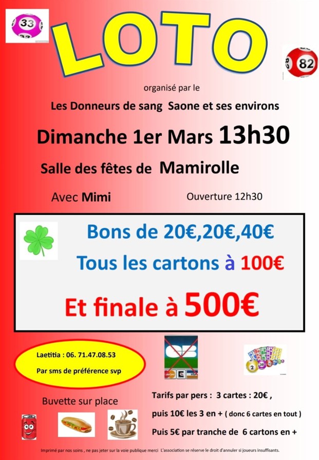 ASSOCIATION DES DONNEURS DE SANG : Loto le dimanche 1er mars à Mamirolle