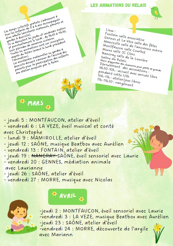 RELAIS PETITE ENFANCE DU PLATEAU : Agenda mars/avril 2026